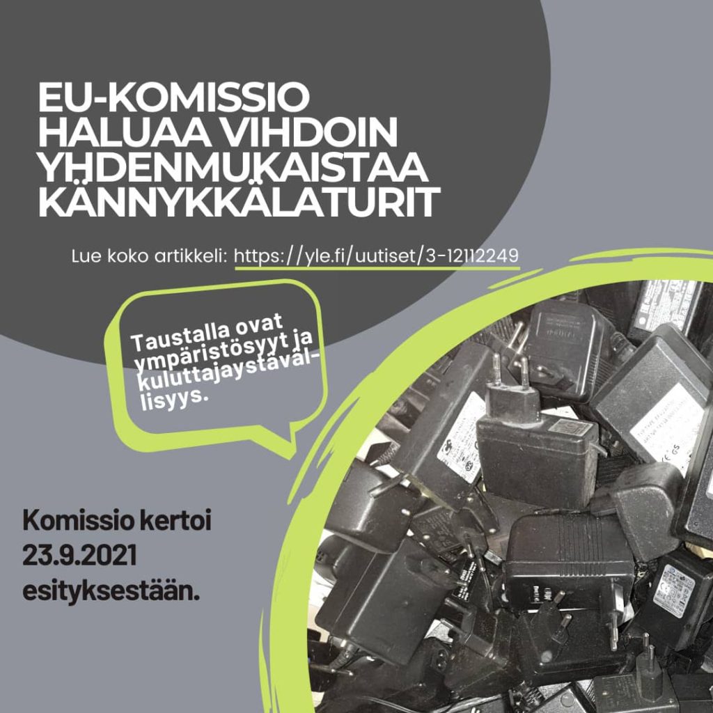 ”Taustalla ovat ympäristösyyt ja kuluttajaystävällisyys. Komission esitys vaatii jäsenmaiden ja EU-parlamentin hyväksynnän. Elektroniikkayhtiöt saisivat kahden vuoden siirtymäajan, jos standardisointi toteutuu. Elektroniikkavalmistajista Apple vastustaa hanketta.”